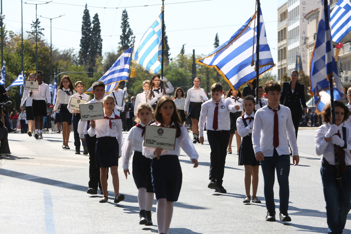 Μαθητές και μαθήτριες παρελαύνουν στη μαθητική παρέλαση για την επετείο της 28ης Οκτωβρίου, Αθήνα, Τρίτη 28 Οκτωβρίου 2025. Με τη μεγάλη στρατιωτική παρέλαση στη Θεσσαλονίκη, ενώπιον του Προέδρου της Δημοκρατίας Κωνσταντίνου Τασούλα και του πρωθυπουργού Κυριάκου Μητσοτάκη, και με τις σχολικές παρελάσεις σε όλη τη χώρα, κορυφώνονται σήμερα οι εορταστικές εκδηλώσεις για την Εθνική Επέτειο της 28ης Οκτωβρίου 1940. ΑΠΕ-ΜΠΕ/ΑΠΕ-ΜΠΕ/ΑΛΕΞΑΝΔΡΟΣ ΜΠΕΛΤΕΣ