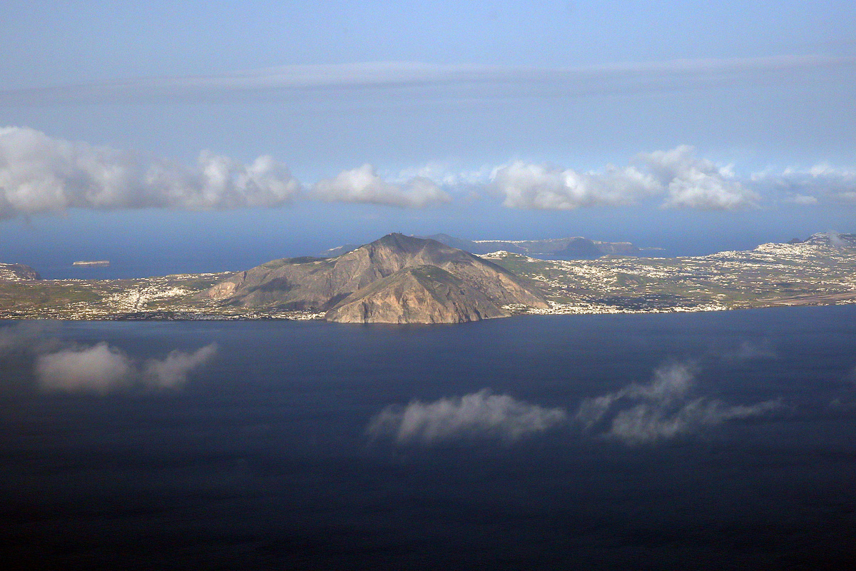 Αεροφωτογραφία της Σαντορίνης, Τρίτη 4 Φεβρουαρίου 2025. Στο «χορό των Ρίχτερ» εξακολουθεί να βρίσκεται η περιοχή των Κυκλάδων. Είναι χαρακτηριστικό ότι έχουν καταγραφεί 550 δονήσεις στη θαλάσσια περιοχή μεταξύ Σαντορίνης, Αμοργού και Ίου το τελευταίο τριήμερο με μέγεθος άνω των 3 Ρίχτερ και με μέγιστο καταγεγραμμένο τα 4,9. Μια τέτοια ιδιαίτερα αισθητή δόνηση σημειώθηκε στις 04:46 τα ξημερώματα της Τρίτης με επίκεντρο 20 χιλιόμετρα Νότια -Νοτιοδυτικά της Αρκεσίνης Αμοργού. Συνεχίζονται και σήμερα οι αναχωρήσεις κατοίκων της Σαντορίνης από το νησί, λόγω της έντονης σεισμικής δραστηριότητας η οποία βρίσκεται σε εξέλιξη για τέταρτη ημέρα. Πλοία και αεροπλάνα αναχωρούν με μεγάλη πληρότητα, με τους κατοίκους που αφήνουν πίσω τις περιουσίες τους να εκφράζουν την ανησυχία τους για το φαινόμενο. ΑΠΕ-ΜΠΕ / ΑΠΕ-ΜΠΕ / ΟΡΕΣΤΗΣ ΠΑΝΑΓΙΩΤΟΥ