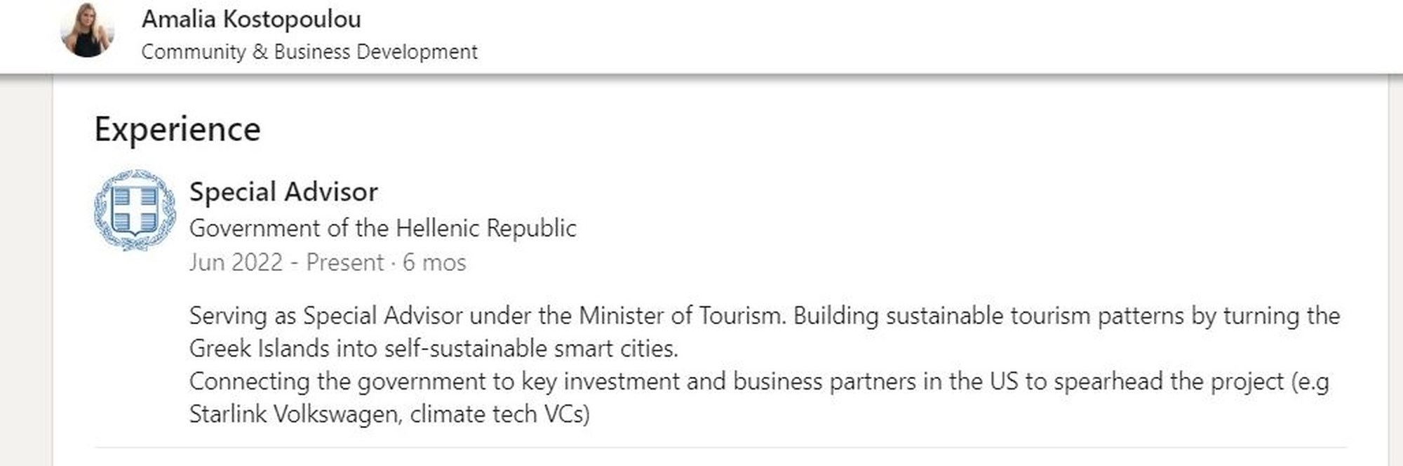 Ωστόσο, η όλη ιστορία ξεκίνησε από τις προσωπικές αναρτήσεις της κ. Κωστοπούλου στα κοινωνικά δίκτυα, στα οποία η ίδια δήλωνε «ειδική σύμβουλος» στο υπουργείο Τουρισμού και ότι εργάζεται για την ελληνική κυβέρνηση.