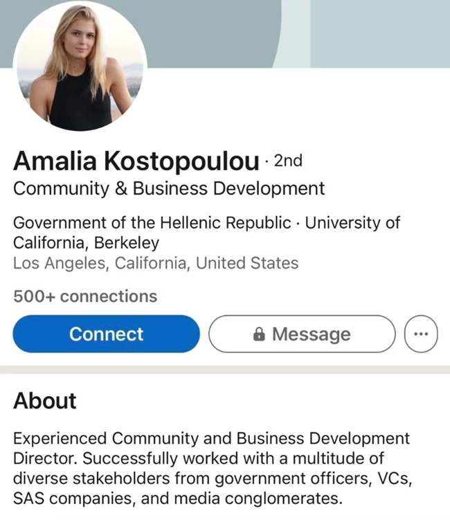 Σάλος δημιουργήθηκε από πληροφορίες που διέρρευσαν τις τελευταίες ώρες, αναφορικά με την εργασία της μεγάλης κόρης της Τζένης Μπαλατσινού, Αμαλίας Κωστοπούλου, η οποία εμφανιζόταν στο LinkedIn να εργάζεται για την ελληνική κυβέρνηση και συγκεκριμένα ως ειδική σύμβουλος του υπουργού Τουρισμού, Βασίλη Κικίλια.