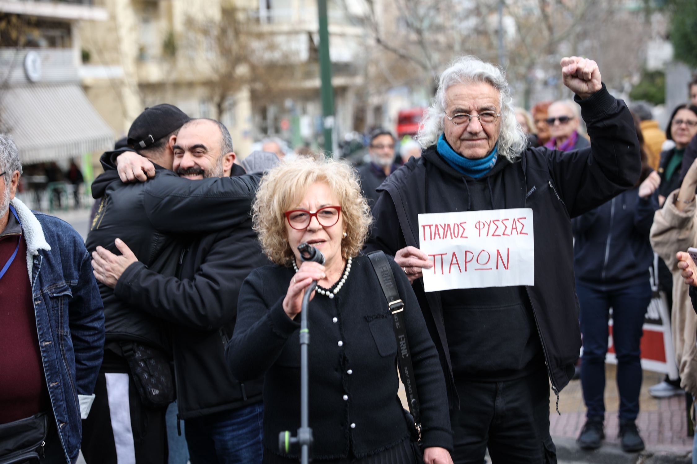 Η Μάγδα Φύσσα, ακλόνητη στη θέση της στην δικαστική αίθουσα σε κάθε δικάσιμο, αμέσως μετά την ανακοίνωση της απόφασης αγκάλιασε τους συνηγόρους της Υποστήριξης της Κατηγορίας και βγήκε έξω να μιλήσει στους συγκεντρωμένους. Καθώς τους πλησίαζε στα μεγάφωνα ακούγονταν τραγούδια του γιου της.