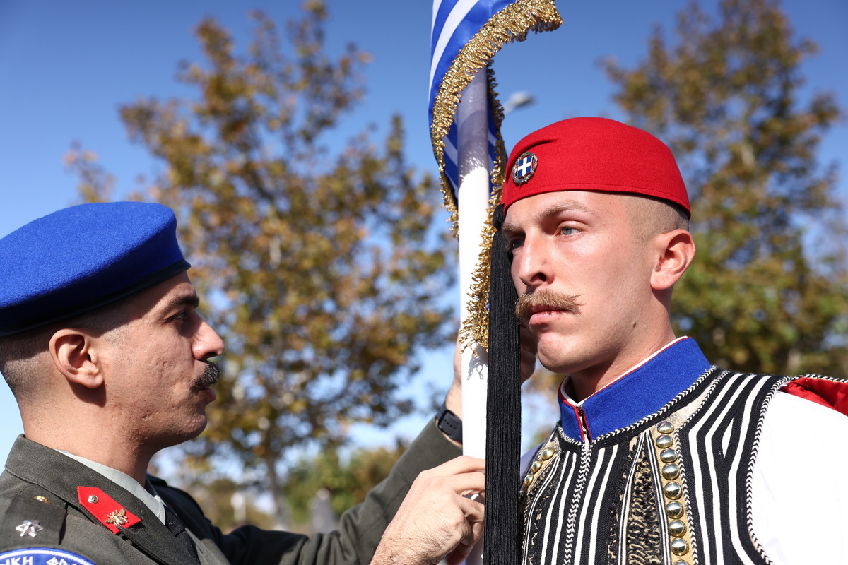 Εύζωνας δέχεται τις τελευταίες φροντίδες λίγο πριν ξεκινήσει η στρατιωτική παρέλαση για την επέτειο της 28ης Οκτωβρίου 1940, στη Θεσσαλονίκη, Τρίτη 28 Οκτωβρίου 2025. Με τη μεγάλη στρατιωτική παρέλαση στη Θεσσαλονίκη, ενώπιον του Προέδρου της Δημοκρατίας Κωνσταντίνου Τασούλα και του πρωθυπουργού Κυριάκου Μητσοτάκη και με τις σχολικές παρελάσεις σε όλη τη χώρα, κορυφώνονται σήμερα οι εορταστικές εκδηλώσεις για την Εθνική Επέτειο της 28ης Οκτωβρίου 1940. ΑΠΕ-ΜΠΕ/ΑΠΕ-ΜΠΕ/ΑΧΙΛΛΕΑΣ ΧΗΡΑΣ