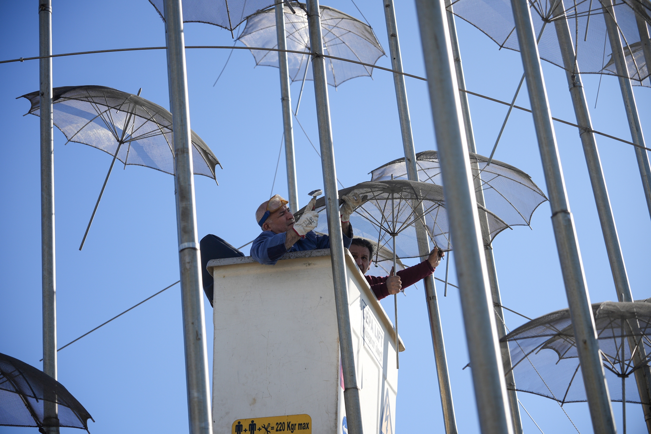 Thessaloniki Municipality workers remove umbrellas from the sculpture by Georgios Zongolopoulos for maintenance purposes, Thessaloniki, October 29, 2025. A total of 17 umbrellas will be removed. / Εργαζόμενοι του Δήμου Θεσσαλονίκης αφαιρούν ομπρέλες από το γλυπτό του Γεώργιου Ζογγολόπουλου για λόγους συντήρησης, Θεσσαλονίκη, 29 Οκτωβρίου 2025. Συνολικά θα αφαιρεθούν 17 ομπρέλες.