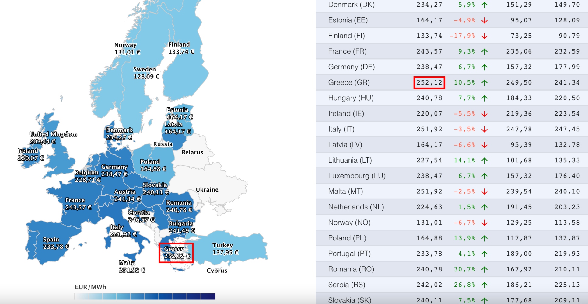 Πιο συγκεκριμένα, σήμερα, Τρίτη του Πάσχα η τιμή της μεγαβατώρας για το επόμενο 24ωρο βρίσκεται στα 252,12 ευρώ, μεγαλύτερη μεταξύ των χωρών που παρακολουθούνται.