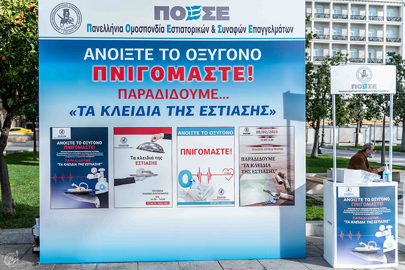 Στην κινητοποίηση που πραγματοποιήθηκε από την ΠΟΕΣΕ στο Σύνταγμα βρέθηκαν ο πρόεδρος του Επαγγελματικού Επιμελητηρίου Αθηνών Γιάννης Χατζηθεοδοσίου και ο αντιπρόεδρος του Νίκος Γρέντζελος, και όπως σημειώνεται από το επιμελητήριο, ο κλάδος της εστίασης, αντιμετωπίζει τεράστια προβλήματα λόγω της πανδημίας, με 4 στις 10 επιχειρήσεις να δηλώνουν ότι βρίσκονται μπροστά στο φάσμα του λουκέτου.