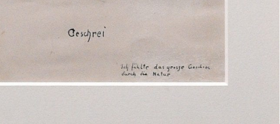 Η λιθογραφία, σε αντίθεση με τις έγχρωμες εκδοχές του πίνακα, περιέχει μια σημείωση του ίδιου του Munch στην οποία γράφει: «Ένιωσα την μεγάλη κραυγή μέσα από την φύση».