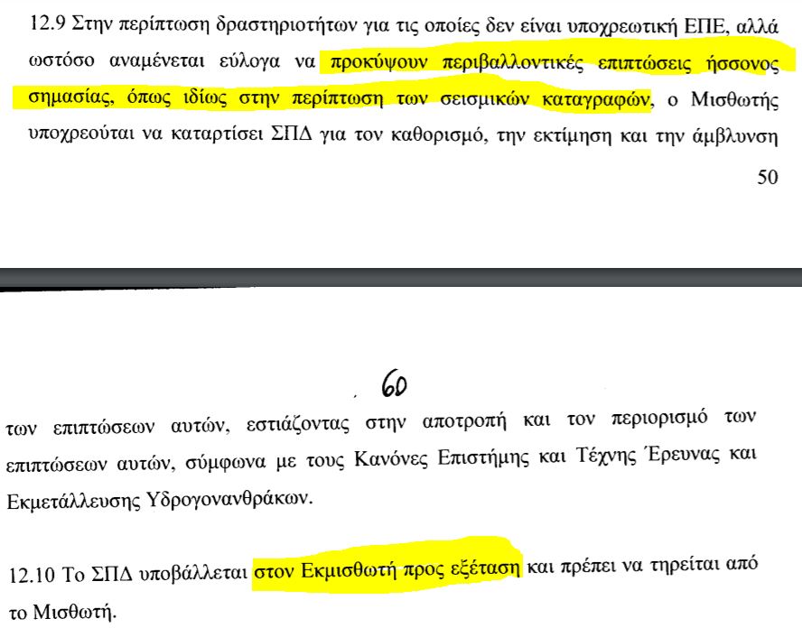 Στο άρθρο 12 των συμβάσεων παραχώρησης 50.000 τ.χλμ σε Ιόνιο και Κρήτη που κυρώθηκε την Τρίτη, υπάρχει πρόβλεψη που πρακτικά απαλλάσσει τις εταιρίες από την υποχρέωση εκπόνησης περιβαλλοντικής μελέτης (ΜΠΕ) στο στάδιο των σεισμικών ερευνών, η οποία θα ήταν δημόσια και θα τελούσε υπό διαβούλευση, κατά παράβαση φυσικά του ευρωπαϊκού δικαίου.