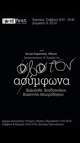Στo πλαίσιo στου 4ου ATNENS PRINT FEST η Καληάνθη Βογδοπούλου και η Βαλεντίνη Μαυροδόγλου, δυο παλιές φίλες, με κοινές εμπειρίες συμπόρευσης στη ζωή και την τέχνη, παρουσιάζουν την έκθεση χαρακτικής, Άβατον Ασύμφωνα, στο Κέντρο Χαρακτικής Αθηνών