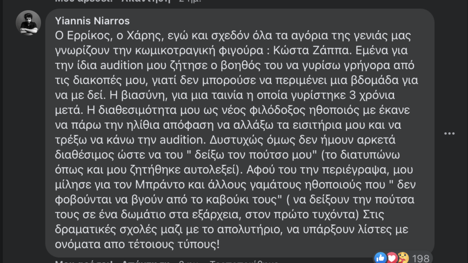 Αν και ο Ερρίκος Μηλιάρης δεν αποκαλύπτει το όνομα του σκηνοθέτη, στα σχόλια κάτω από την ανάρτηση, ο ηθοποιός Χάρης Τζωρτζάκης αναφέρεται στον σκηνοθέτη Κώστα Ζάπα υποστηρίζοντας ότι και ο ίδιος είχε ανάλογη εμπειρία. Τις καταγγελίες συμπληρώνει και επιβεβαιώνει ο ηθοποιός Γιάννης Νιάρρος.