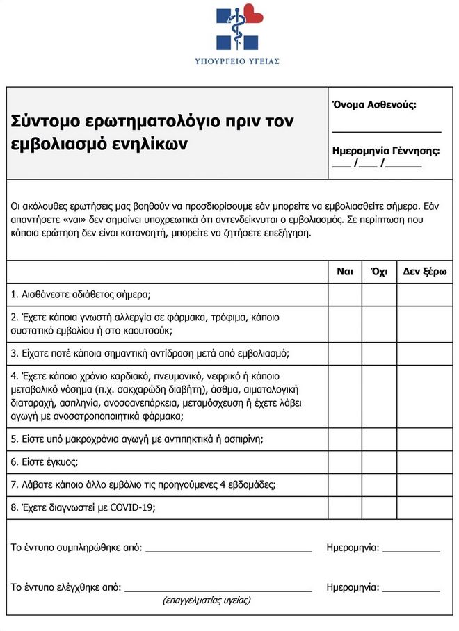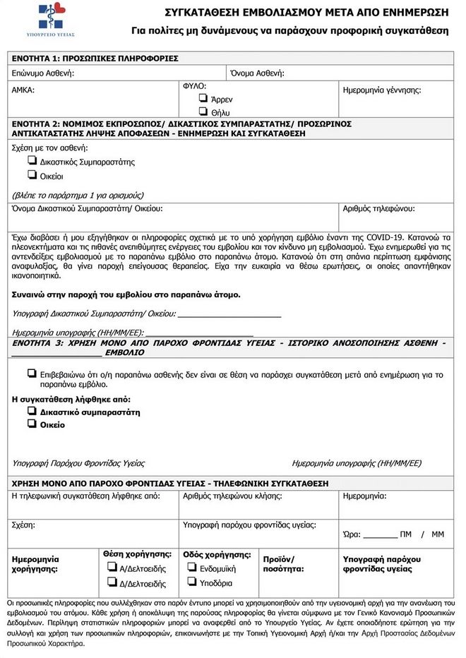Αυτά τα έντυπα ήδη έχουν σταλεί στα κέντρα εμβολιασμών και θα πρέπει να συμπληρώνονται από τους πολίτες.