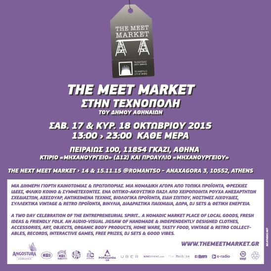 The Meet Market: Μια διήμερη γιορτή καινοτομίας και πρωτοπορίας. Μία νομαδική αγορά από τοπικά προϊόντα, φρέσκιες ιδέες, φιλικό κοινό και συμμετέχοντες. Ένα οπτικό-ακουστικό παζλ από χειροποίητα ρούχα ανεξάρτητων σχεδιαστών, αξεσουάρ, αντικείμενα τέχνης, οργανικά προϊόντα υγιεινής, είδη σπιτιού, νόστιμες λιχουδιές, συλλεκτικά vintage & retro προϊόντα, βινύλια, διαδραστικά παιχνίδια, δώρα, DJ sets και θετική ενέργεια.