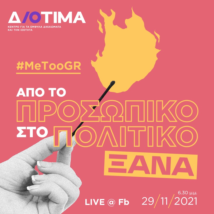 Με αφορμή την Παγκόσμια Ημέρα Εξάλειψης της Έμφυλης Βίας, το Κέντρο Διοτίμα διοργανώνει τη διαδικτυακή εκδήλωση με θέμα #MetooGR: από το προσωπικό στο πολιτικό ξανά», τη Δευτέρα 29/11, 6:30 μ.μ., σε live αναμετάδοση από την επίσημη σελίδα του φορέα στο facebook και το youtube.