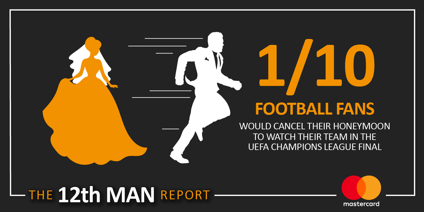 Ενδεικτικό επίσης εύρημα του πόσο μακριά θα έφταναν για την αγαπημένη τους ομάδα οι λάτρεις της στρογγυλής θεάς, είναι και το ότι ένας στους δέκα Ευρωπαίους φιλάθλους παραδέχτηκε ότι θα ακύρωνε ακόμα και τον μήνα του μέλιτος, για να παρακολουθήσει την ομάδα του να παίζει στον τελικό του UEFA Champions League.