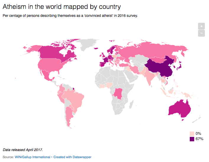 Στην Κίνα υπάρχει ένα 67% ανθρώπων που δηλώνουν «πεπεισμένοι άθεοι», με τον Χονγκ Κονγκ να ακολουθεί με 30% και την Ιαπωνία με 29%.