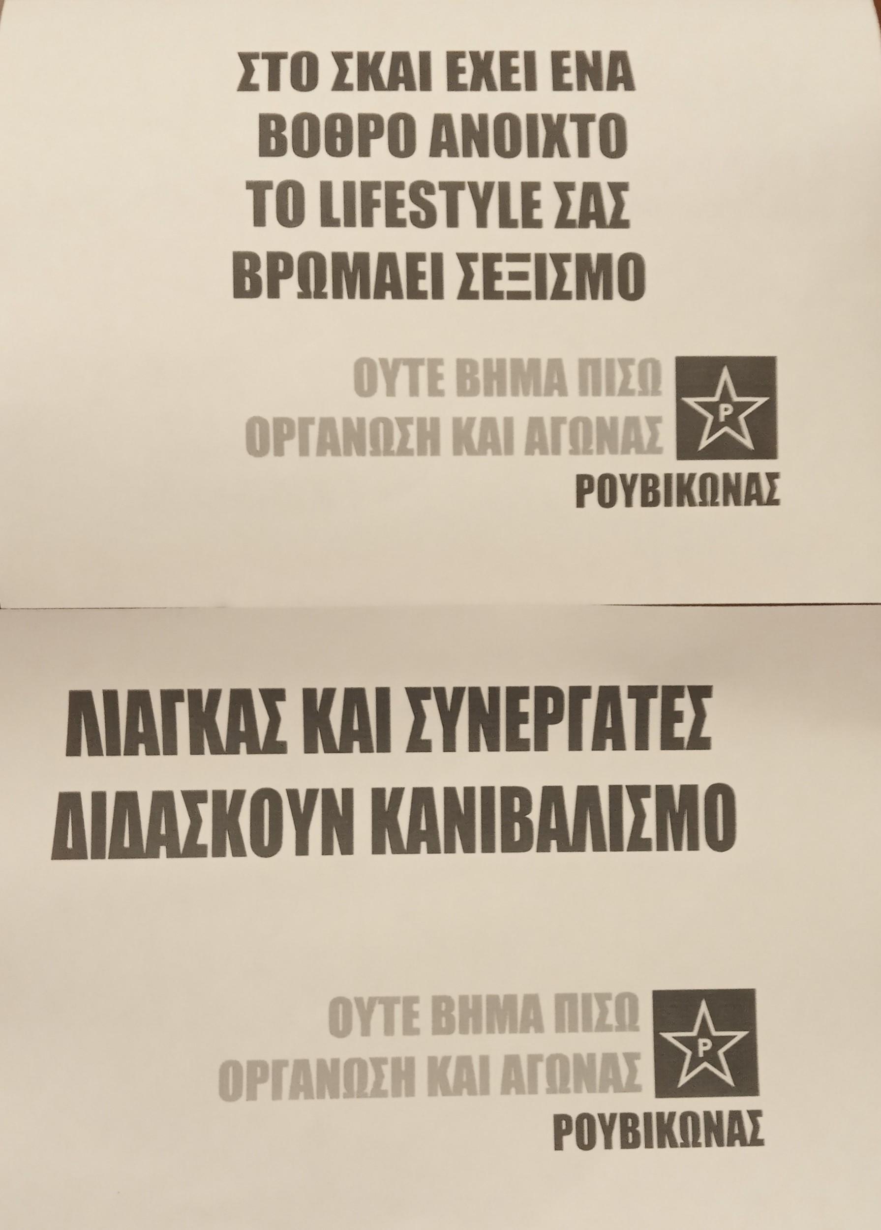 Σε άλλο σημείο τονίζουν: «Από όπου και να πιάσεις τα τηλεσκουπίδια, λερώνεσαι, όπως συμβαίνει, άλλωστε, πάντοτε με κάθε είδους σκουπίδια. Ο Λιάγκας και ο κάθε Λιάγκας, η Γκαγκάκη και η κάθε Γκαγκάκη, ο ΣΚΑΙ και ο κάθε ΣΚΑΙ, όχι μόνο δεν θα μιλήσουν ποτέ σε πραγματική βάση για την αγωνία των γυναικών να γυρίσουν σώες και ασφαλείς στο σπίτι τους περπατώντας μονάχες τους στον δρόμο, δεν θα μιλήσουν ποτέ για την πατριαρχική βία, τις σεξιστικές διακρίσεις, την παρενόχληση, τους βιασμούς, τις γυναικοκτονίες, αλλά θα εργαλειοποιήσουν όλα αυτά για να αυξήσουν τα βρώμικα κέρδη τους. Δεν περιμένουμε ποτέ αυτά τα θέματα να βρεθούν στην ατζέντα-κάδο τους».