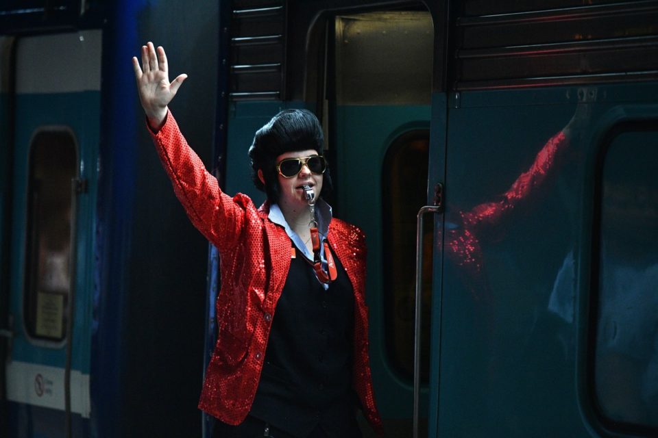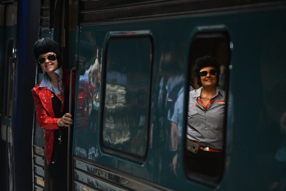 Περιμένοντας την αναχώρηση του τρένου για ένα ταξίδι επτά ωρών, οι λάτρεις του ‘Ελβις, ενός από τα μεγαλύτερα μουσικά σύμβολα του 20ού αιώνα, εναλλάσσονταν πάνω στη σκηνή που είχε διαμορφωθεί στη μεγάλη αίθουσα του σταθμού και τραγουδούσαν τις μεγαλύτερες επιτυχίες του θρύλου του ροκ εν ρολ.