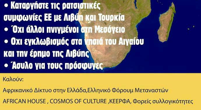 Το Αφρικανικό δίκτυο στην Ελλάδα, το Ελληνικό Φόρουμ Μεταναστών, το African House, το cosmos of culture, η ΚΕΕΡΦΑ, φορείς και συλλογικότητες καλούν σε συλλαλητήριο το μεσημέρι του Σαββάτου 2 Δεκέμβρη, για «ανοιχτά σύνορα», κατάργηση «των συμφωνιών της ντροπής ΕΕ με Λιβύη και Τουρκία» κ.α.. Το Συλλαλητήριο, είναι προγραμματισμένο στις 15.00, στο Σύνταγμα με κεντρικό σύνθημα: «Οχι ξανά σκλάβοι στην Αφρική!».