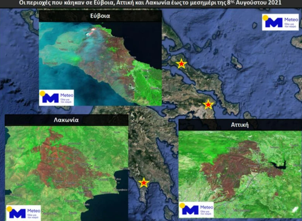 Έως το μεσημέρι της Κυριακής 8 Αυγούστου, είχαν καεί περίπου 460.000 στρέμματα στην Εύβοια, 80.000 στρέμματα στην Αττική και 110.000 στρέμματα στη Λακωνία, ανεβάζοντας το σύνολο των καμένων εκτάσεων τουλάχιστον στα 650.000 στρέμματα. Με δεδομένο ότι οι πυρκαγιές στην Εύβοια συνεχίζουν να καίνε, αυτή η εκτίμηση είναι πολύ πιθανό να μεταβληθεί τις επόμενες ημέρες, σύμφωνα με το meteo του Εθνικού Αστεροσκοπείου Αθηνών (ΕΑΑ).