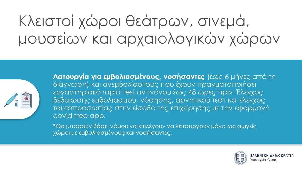 Σημειώνεται πως οι επιχειρήσεις θα μπορούν βάσει νόμου να επιλέγουν να λειτουργούν ως αμιγείς χώροι με εμβολιασμένους και νοσήσαντες.