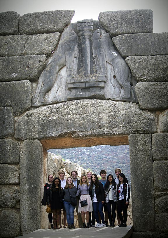Ανάμεσα στους επισκέπτες για τα εγαίναι του Κέντρου ήταν και μια ομάδα 11 δευτεροετών του Princeton. Εδώ στη Πύλη των Λεόντων στις Μυκήνες με τον υπεύθυνο καθηγητή τους Benjamin Morison. Photo: Αριστοτέλης Κοσκινάς