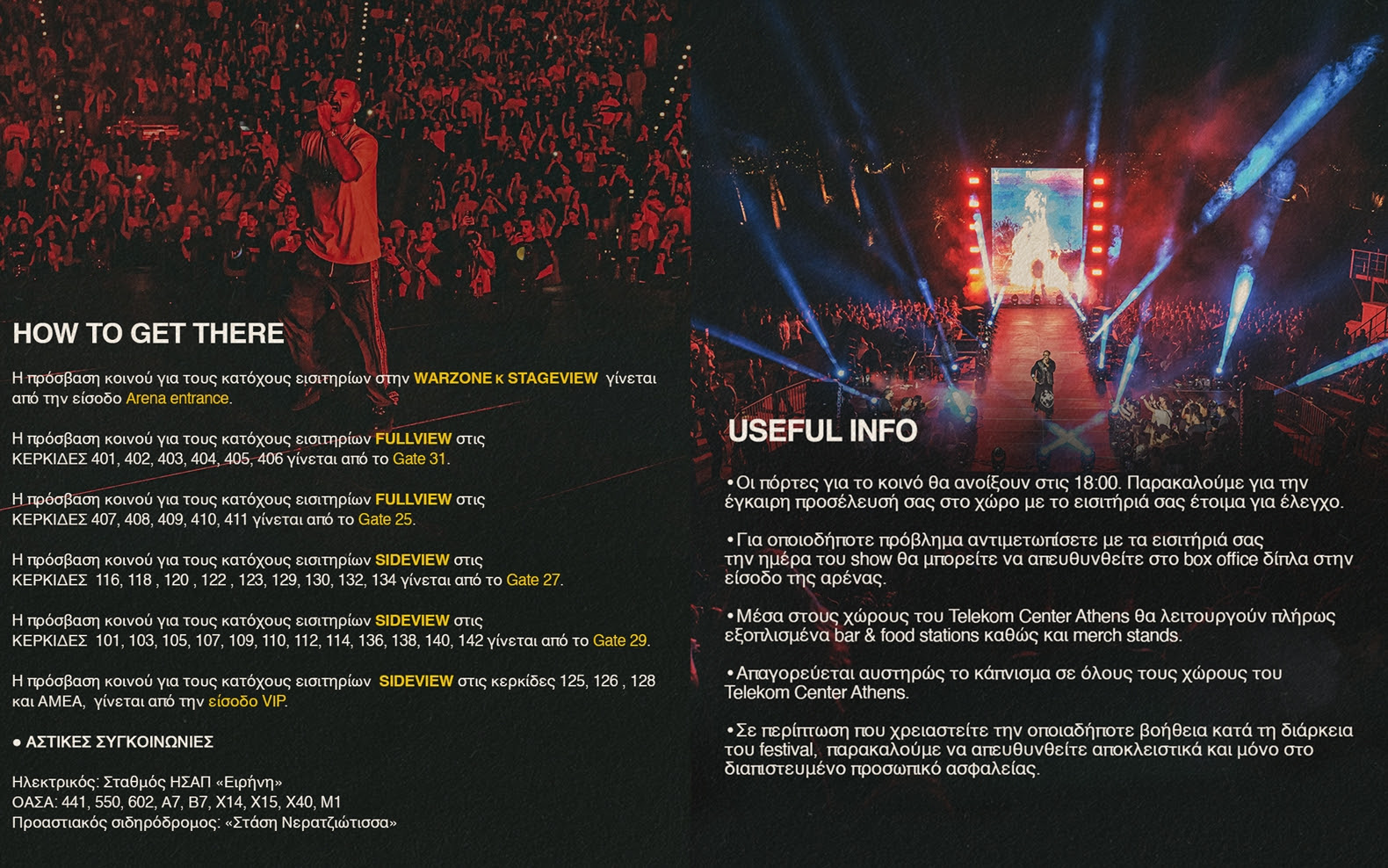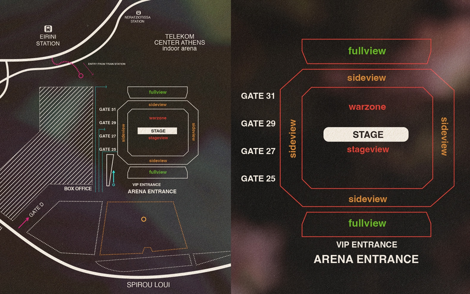 H πρόσβαση κοινού για τους κατόχους εισιτηρίων στην WARZONE κ’ STAGEVIEW γίνεται από την είσοδο Arena entrance.