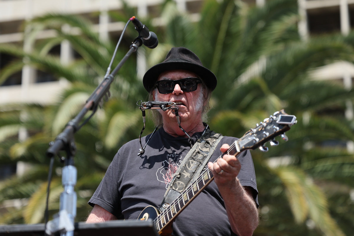 epa12028334 Canadian-American singer-songwriter Neil Young performs on stage during the 'Fighting Oligarchy Tour' rally at Grand Park in Los Angeles, California, USA, 12 April 2025. Thousands of people attended the rally to show support for US Senator Bernie Sanders and US Representative Alexandria Ocasio-Cortez. EPA/DAVID SWANSON
