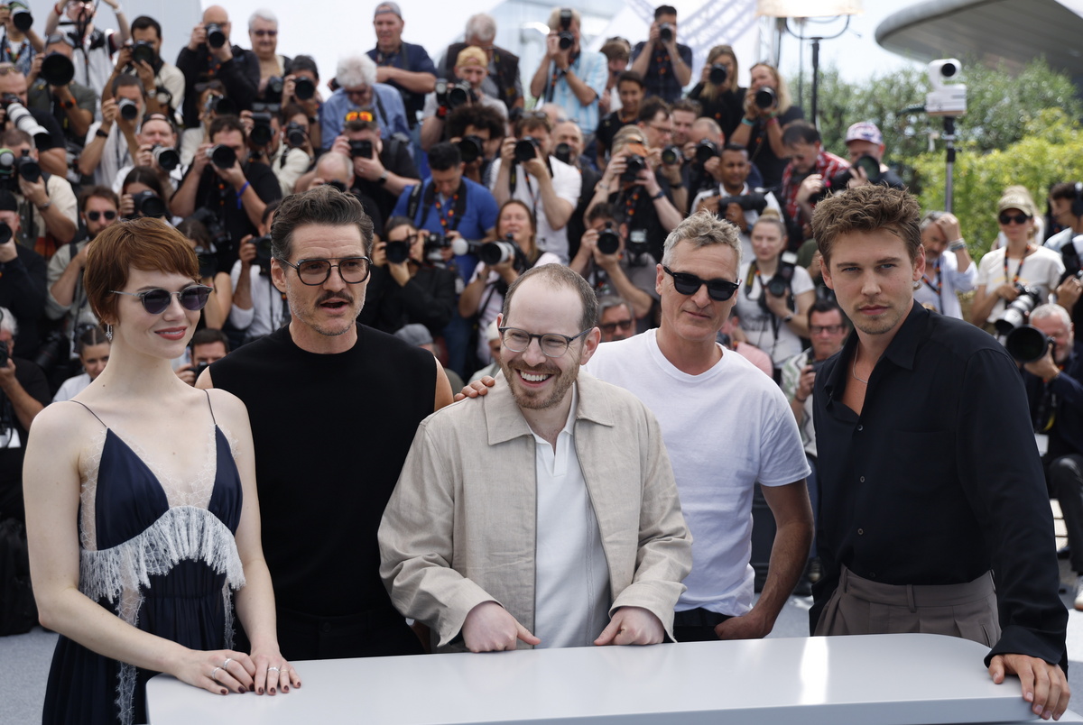 epa12108473 (L-R) Emma Stone, Pedro Pascal, Director Ari Aster, Joaquin Phoenix and Austin Butler attend the photocall for 'Eddington' during the 78th annual Cannes Film Festival, in Cannes, France, 17 May 2025. The film festival runs from 13 to 24 May 2025. EPA/MOHAMMED BADRA