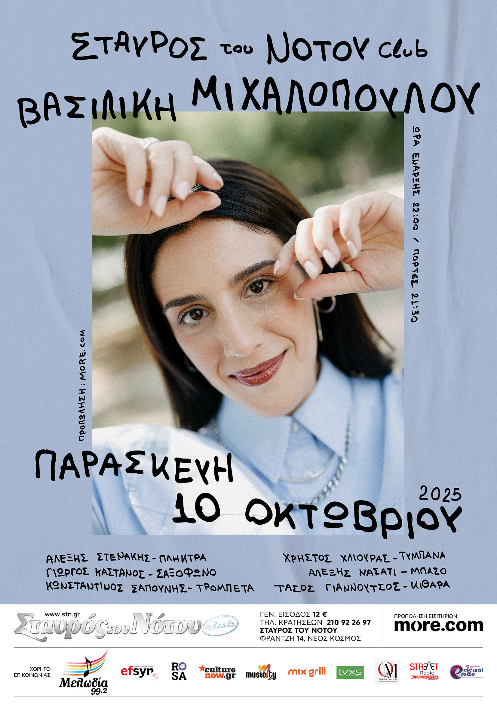 Η Βασιλική Μιχαλοπούλου μας προσκαλεί και φέτος στον Σταυρό του Νότου Club, την Παρασκευή 10 Οκτωβρίου! Η Βασιλική επιστρέφει με ανανεωμένη μπάντα και ρεπερτόριο, για να ξεσηκώσει το κοινό με τα τραγούδια και την δυναμική της ενέργεια στη σκηνή