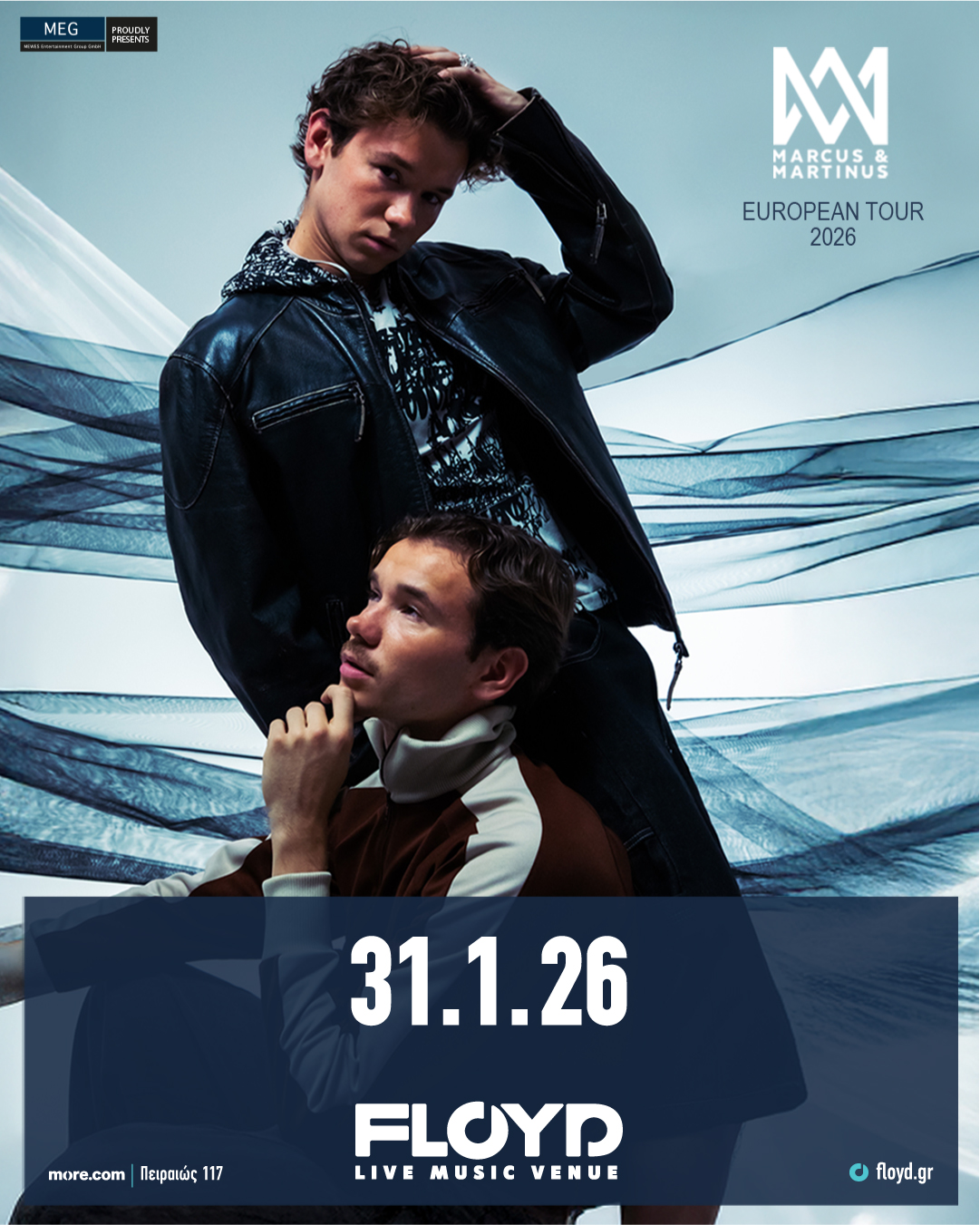 Οι Marcus & Martinus έρχονται στην Αθήνα, το Σάββατο 31 Ιανουαρίου 2026, στο Floyd Live Music Venue! Το νορβηγικό pop ντουέτο που στις πρόσφατες περιοδείες του κυριολεκτικά σαρώνει σε ολόκληρη την Ευρώπη, με απανωτά sold-out shows ακόμα και σε αρένες, επιστρέφει με ένα εντυπωσιακό show που θα ενθουσιάσει παλιούς και νέους fans!