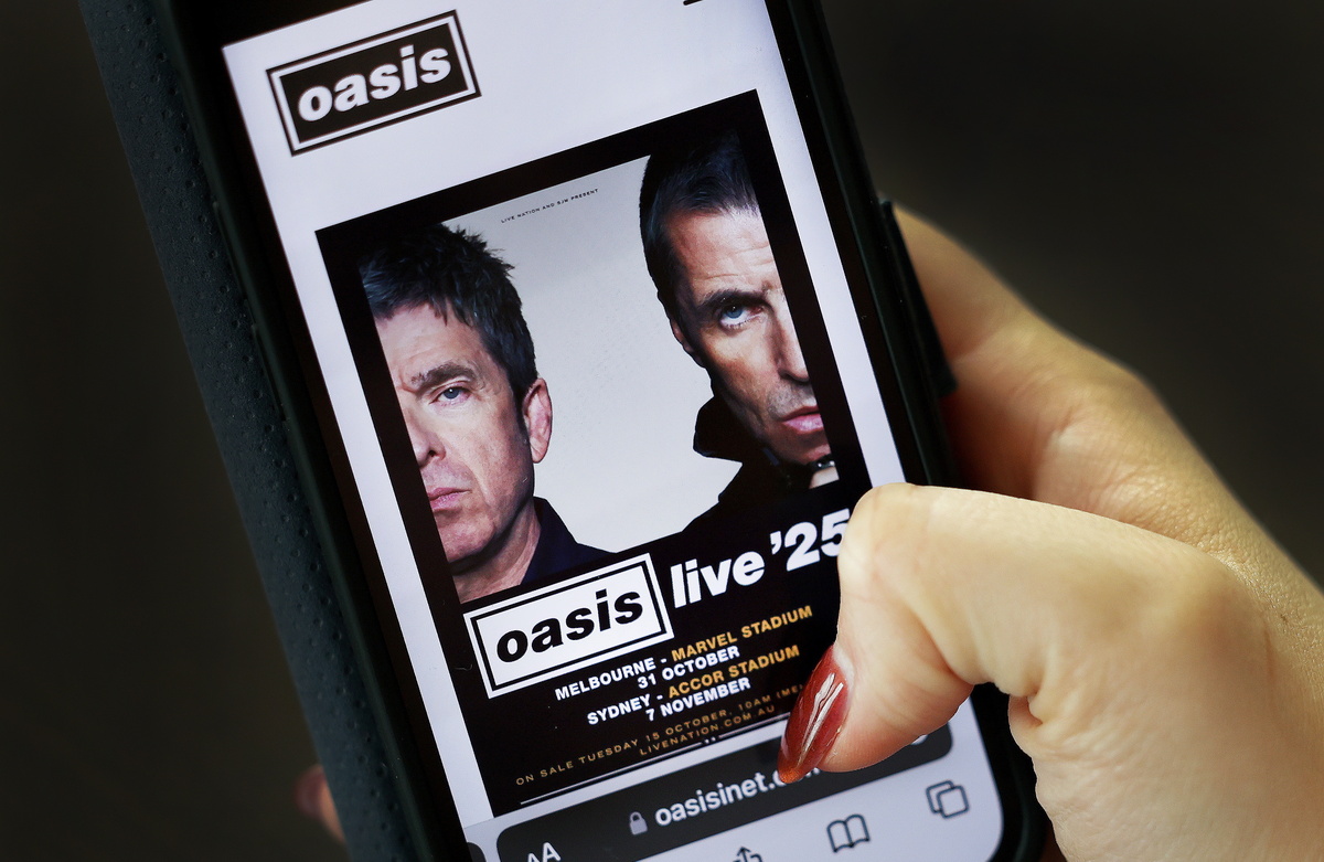 epa11649473 A mobile user looks over at the Oasis reunion tickets on the Oasis live 25 website, in London, Britain, 08 October 2024. Oasis have announced their reunion tour will travel to Australia, with at least two gigs in Melbourne and Sydney. Oasis will play at the Melbourne Marvel Stadium on 31 October 2025 and Sydney's Accor Stadium on 07 November. EPA/ANDY RAIN