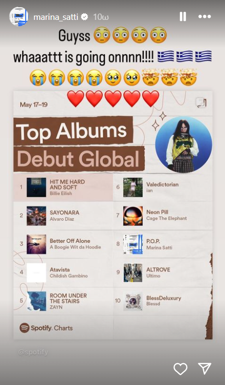 Συγκεκριμένα, με ένα story που έκανε η ίδια στο προφίλ της στο Instagram, η Μαρίνα Σάττι δηλώνει εντυπωσιασμένη για το γεγονός ότι το άλμπουμ της βρίσκεται στα 10 πρώτα του παγκόσμιου chart του Spotify. Σημειώνεται ότι είναι η πρώτη φορά που ένα EP με ελληνικά τραγούδια φιγουράρει στα κορυφαία νέα άλμπουμ του κόσμου στο Spotify.