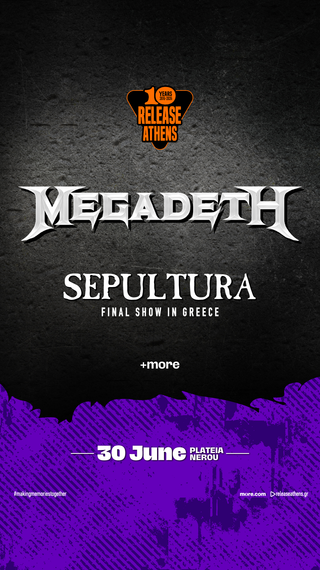 Το Release Athens 2026 υποδέχεται τους Megadeth και τους Sepultura, την Τρίτη 30 Ιουνίου, στην Πλατεία Νερού. Δύο από τα πιο καθοριστικά ονόματα στην ιστορία του heavy metal ανεβαίνουν στην ίδια σκηνή, στο πλαίσιο των αποχαιρετιστήριων περιοδειών τους, για μια βραδιά υψηλού συμβολισμού που θα αποτελέσει το τελευταίο μεγάλο τους ραντεβού με το ελληνικό κοινό. Μια ανεπανάληπτη στιγμή, με την υπογραφή δύο συγκροτημάτων που άλλαξαν για πάντα τον σκληρό ήχο.