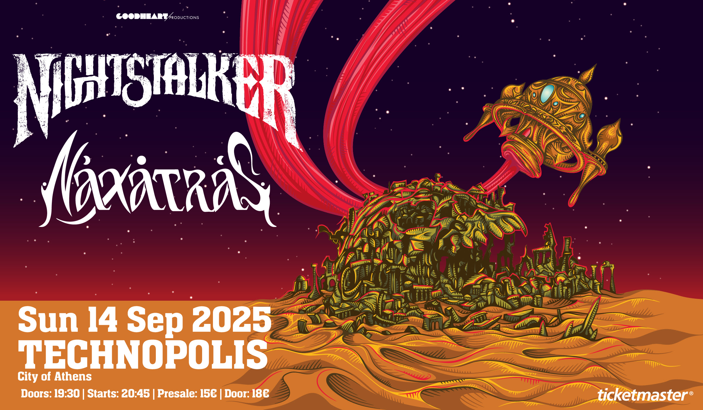 Οι Nightstalker και οι Naxatras επιστρέφουν στην Τεχνόπολη για μια δυνατή βραδιά! Ένα double bill έντασης, ψυχεδέλειας, θρυλικών riffs και μουσικής υπέρβασης, με δύο σχήματα σε απόλυτα δημιουργική φάση και εξαιρετική φόρμα!