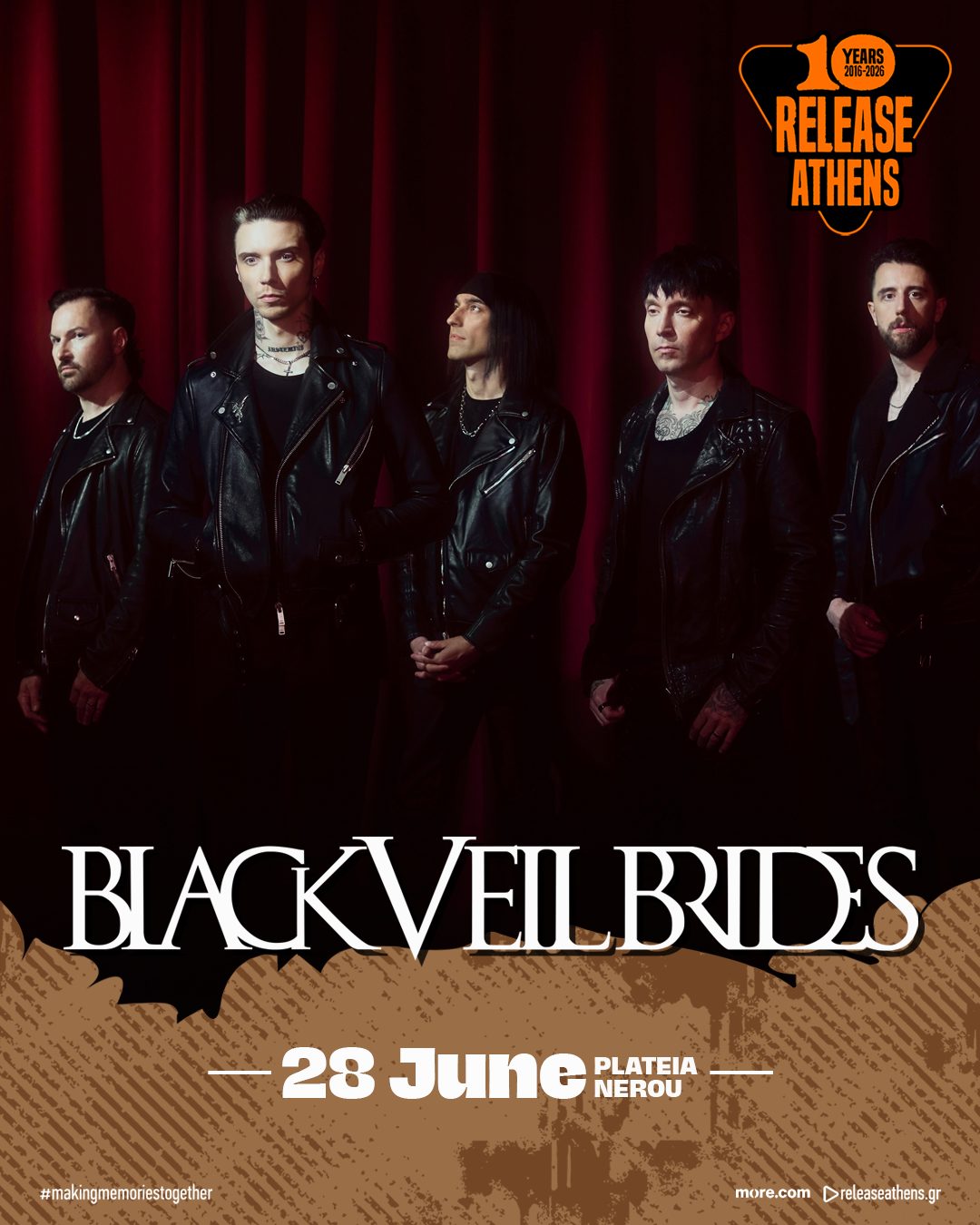 Το Release Athens 2026 υποδέχεται τους Black Veil Brides την Κυριακή 28 Ιουνίου, στην Πλατεία Νερού. Το αμερικανικό συγκρότημα, μία από τις πιο χαρακτηριστικές μπάντες της σύγχρονης alternative/hard rock σκηνής, έρχεται να πλαισιώσει τους Three Days Grace, ικανοποιώντας ένα μεγάλο απωθημένο του εγχώριου κοινού που περίμενε χρόνια να τους δει ζωντανά.