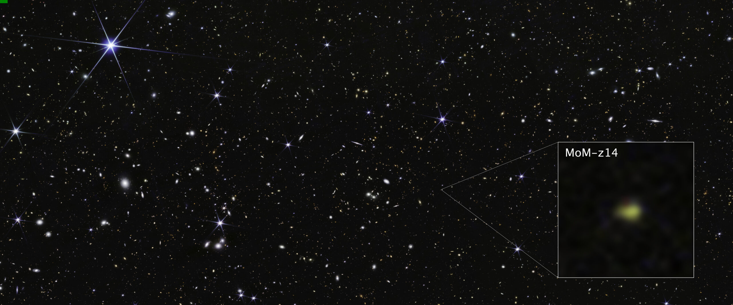 The galaxy designated MoM-z14 is currently the farthest galaxy ever detected, spotted by the NASA/ESA/CSA James Webb Space Telescope’s NIRCam (Near-Infrared Camera) and confirmed spectroscopically with its NIRSpec (Near-Infrared Spectrograph) instrument. Through Webb, we are seeing this galaxy as it appeared in the distant past, only 280 million years after the Universe began in the big bang. Its light has traveled through space for more than 13 billion years to reach us. Like some other galaxies Webb has discovered in the early Universe, MoM-z14 is brighter, more compact, and more chemically enriched than astronomers expected to find in this early era. While it may pass out of record books quickly as the farthest galaxy, MoM-z14 will still play a role in helping astronomers and theorists reach new understanding of the earliest chapters in the Universe’s story. [Image description: A wide field of view showing deep space, dotted with many small galaxies and a few foreground stars that display six diffraction spikes. One galaxy is highlighted with a magnified image in a graphic pull-out box in the lower right corner. The galaxy is labeled MoM-z14 and appears as a blurry yellow blob with a small red area at its top.]