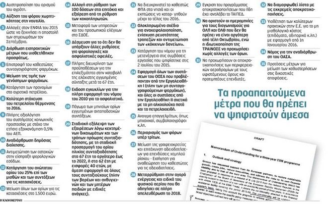Η Καθημερινή δημοσιεύει το προσχέδιο του νέου Μνημονίου, που περιλαμβάνει ένα βαρύ πακέτο προαπαιτούμενων, που θα πρέπει να ψηφιστούν άμεσα κι ένα δεύτερο, εξίσου βαρύ, που θα πρέπει να υιοθετηθεί από τον Οκτώβριο και μετά.