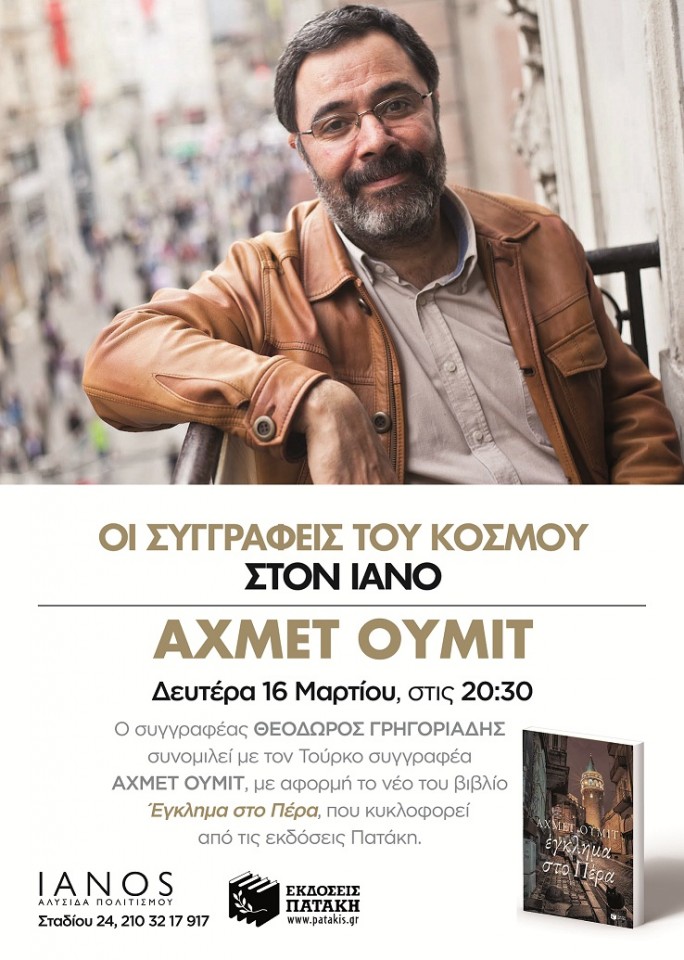 Στο πλαίσιο του κύκλου εκδηλώσεων «Οι συγγραφείς του κόσμου στον ΙΑΝΟ», ο συγγραφέας Θεόδωρος Γρηγοριάδης συνομιλεί με τον Τούρκο συγγραφέα Αχμέτ Ουμίτ για τη ζωή του, το έργο του, τη λογοτεχνία αλλά και θέματα που άπτονται της επικαιρότητας, με αφορμή το νέο του βιβλίο με τίτλο Έγκλημα στο Πέρα, που κυκλοφορεί από τις εκδόσεις Πατάκη, σε μετάφραση Θάνου Ζαράγκαλη.