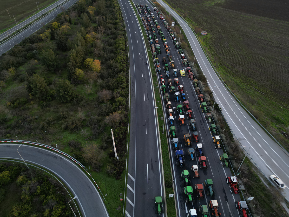 Φωτογραφία που έχει τραβηχτεί με drone και εικονίζει αγρότες με τα τρακτέρ τους πραγματοποιούν μπλόκο στην περιοχή της Νίκαιας, κατά τη διάρκεια των αγροτικών κινητοποιήσεων στη Λάρισα, Τρίτη 9 Δεκεμβρίου 2025. Χιλιάδες τρακτέρ κατακλύζουν τις Εθνικές Οδούς, αποκλείουν κομβικά σημεία απ' άκρη σ' άκρη της χώρας, ενισχύουν τα υπάρχοντα μπλόκα και στήνουν νέα. ΑΠΕ-ΜΠΕ/ΑΠΕ-ΜΠΕ/ΝΙΚΟΣ ΧΑΤΖΗΠΟΛΙΤΗΣ