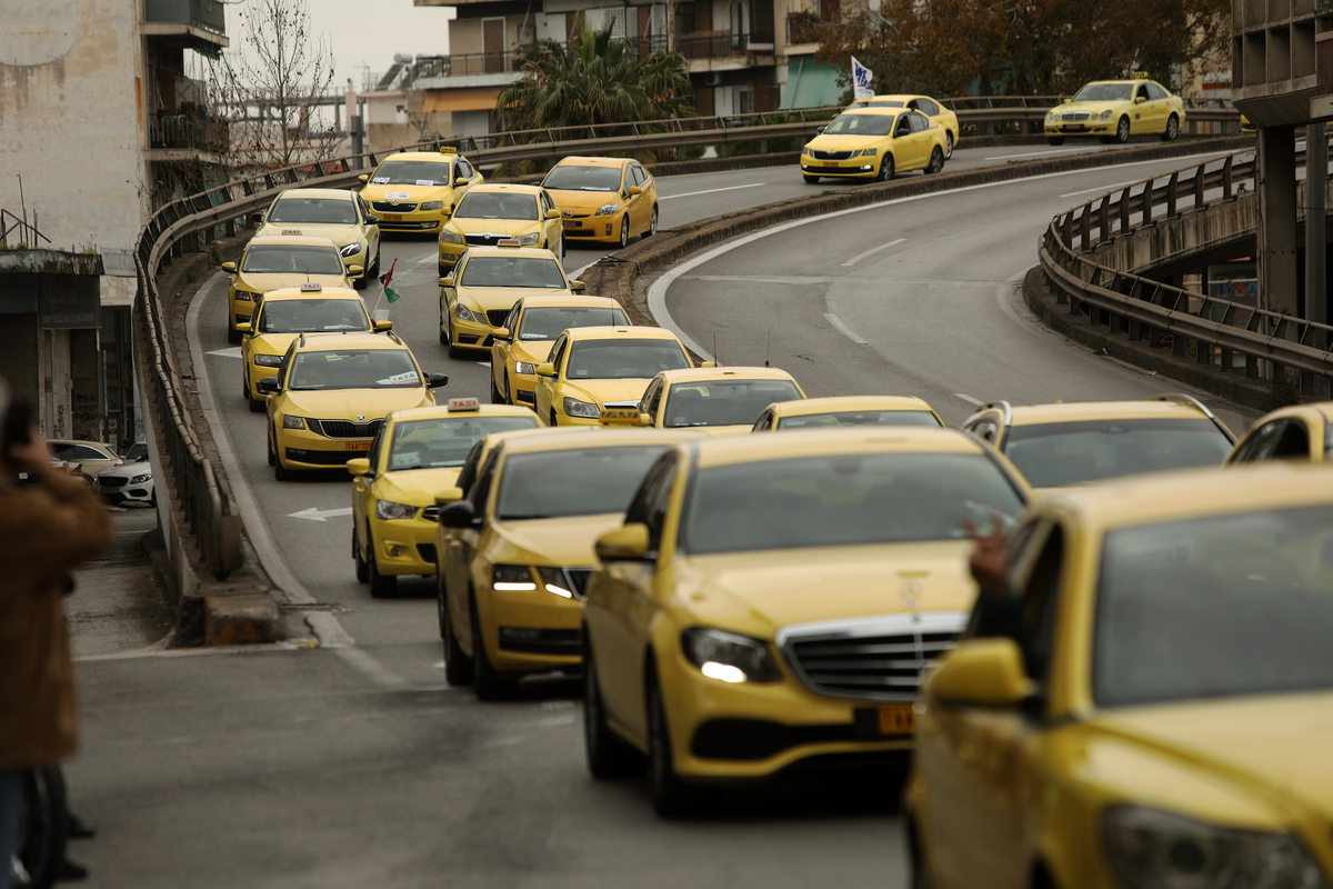 Οδηγοί ταξί πραγματοποιούν συγκέντρωση και πορεία διαμαρτυρίας με τα οχήματά τους από το κέντρο της Αθήνας προς το Υπουργείο Υποδομών και Μεταφορών, την Τρίτη 27 Φεβρουαρίου 2024. Οι ιδιοκτήτες ταξί έχουν εξαγγείλει 48ωρη απεργία την Τρίτη 27 και την Τετάρτη 28 Φεβρουαρίου 2024, μετά από απόφαση του Σ.Α.Τ.Α. διεκδικώντας την επίλυση αιτημάτων του κλάδου τους. ΑΠΕ-ΜΠΕ/ΑΠΕ-ΜΠΕ/ΓΙΩΡΓΟΣ ΒΙΤΣΑΡΑΣ