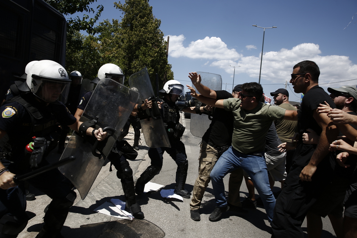 Αστυνομικές δυνάμεις συγκρούονται με φοιτητές που προσπάθησαν να κολλήσουν αφίσα στην αστυνομική κλούβα, κατά τη διάρκεια διαμαρτυρίας τους ενάντια στο νέο νομοσχέδιο για την Παιδεία που προωθεί η κυβέρνηση, Ανάβυσσος, Παρασκευή 11 Ιουλίου 2025. ΑΠΕ-ΜΠΕ/ΑΠΕ-ΜΠΕ/ ΓΙΑΝΝΗΣ ΚΟΛΕΣΙΔΗΣ