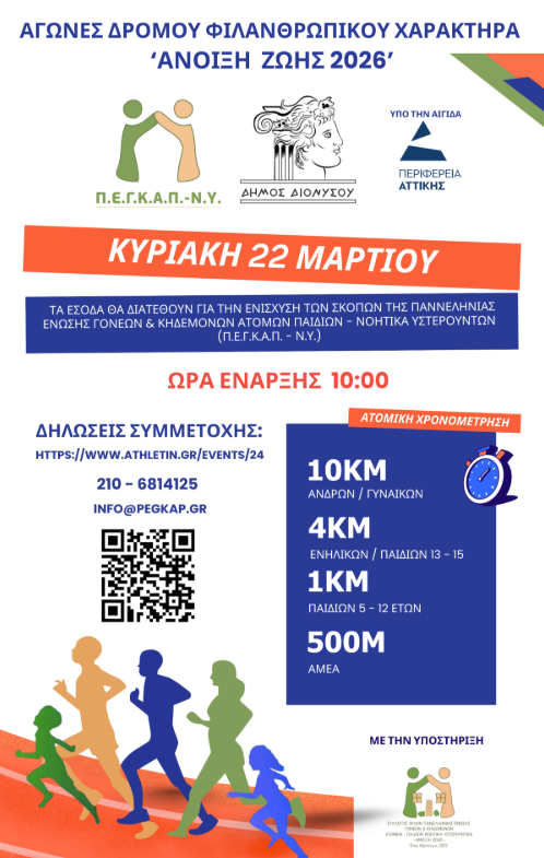 Η ΠΕΓΚΑΠ – ΝΥ και ο Δήμος Διονύσου υπό την Αιγίδα της Περιφέρειας Αττικής και με την υποστήριξη του Συλλόγου Φίλων της Π.Ε.Γ.Κ.Α.Π.-Ν.Υ. «ΑΝΟΙΞΗ ΖΩΗΣ» διοργανώνουν τους αγώνες δρόμου ‘Τρέχω για την Άνοιξη ζωής 2026’ την Κυριακή 22 Μαρτίου 2026 και ώρα 10:00 με αφετηρία τη Λεωφόρο Δροσιάς – Σταμάτας ( κοντά στην πλατεία Δροσιάς).
