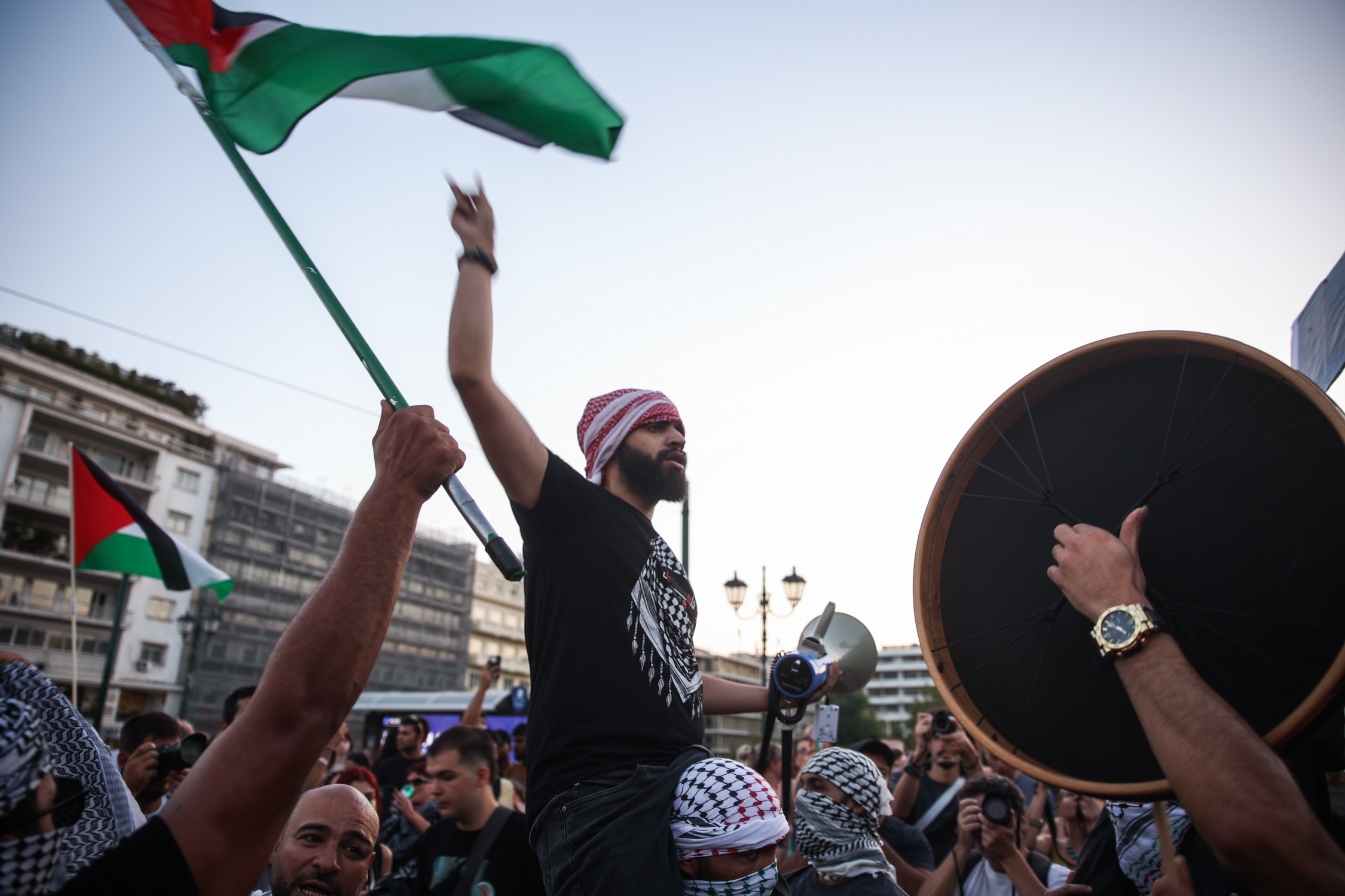 Στην Αθήνα χιλιάδες πολίτες βρέθηκαν στο Σύνταγμα σε μία πορεία αλληλεγγύης, φωνάζοντας για το τέλος της σφαγής των Παλαιστινίων της Γάζας.