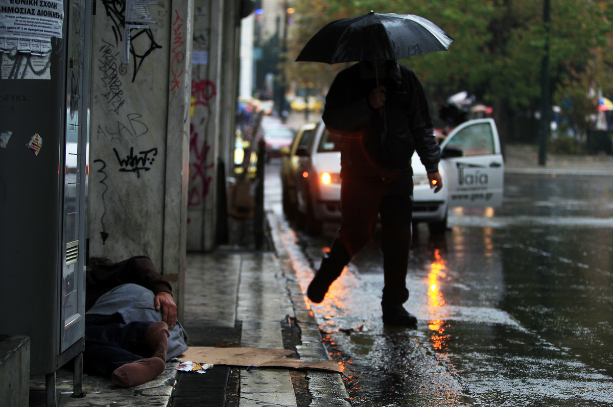 Ένας άστεγος κοιμάται σε πεζοδρόμιο στην πλατεία Συντάγματος ενώ βρέχει στο κέντρο της Αθήνας, Σάββατο 29 Δεκεμβρίου 2012. ΑΠΕ-ΜΠΕ/ΑΠΕ-ΜΠΕ/ΣΥΜΕΛΑ ΠΑΝΤΖΑΡΤΖΗ