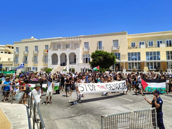 Ειρηνική συγκέντρωση υπέρ της Παλαιστίνης πραγματοποιήθηκε χθες το πρωί στη Σύρο με αφορμή την άφιξη του κρουαζιερόπλοιου Crown Iris που μετέφερε Ισραηλινούς επιβάτες.