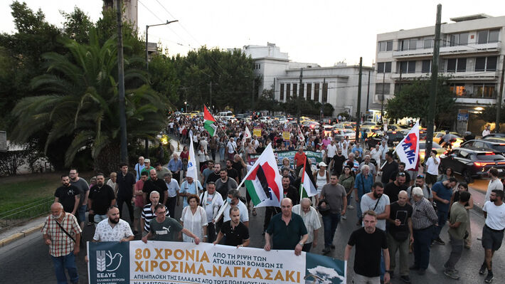 Νωρίτερα, πλήθος κόσμου είχε συγκεντρωθεί κάτω από τον Ιερό Βράχο της Ακρόπολης, ανταποκρινόμενο στο κάλεσμα της ΕΕΔΥΕ προκειμένου να αποτίσει φόρο τιμής και μνήμης «στα εκατοντάδες χιλιάδες θύματα της θηριωδίας σε Χιροσίμα και Ναγκασάκι», αλλά και να απαιτήσει «να σταματήσει εδώ και τώρα η γενοκτονία που υφίσταται ο λαός της Παλαιστίνης από το κράτος – μακελάρη του Ισραήλ, με τη στήριξη ΗΠΑ, ΝΑΤΟ, ΕΕ και αστικών κυβερνήσεων», καταδικάζοντας παράλληλα «την εμπλοκή της Ελλάδας στους ιμπεριαλιστικούς σχεδιασμούς».