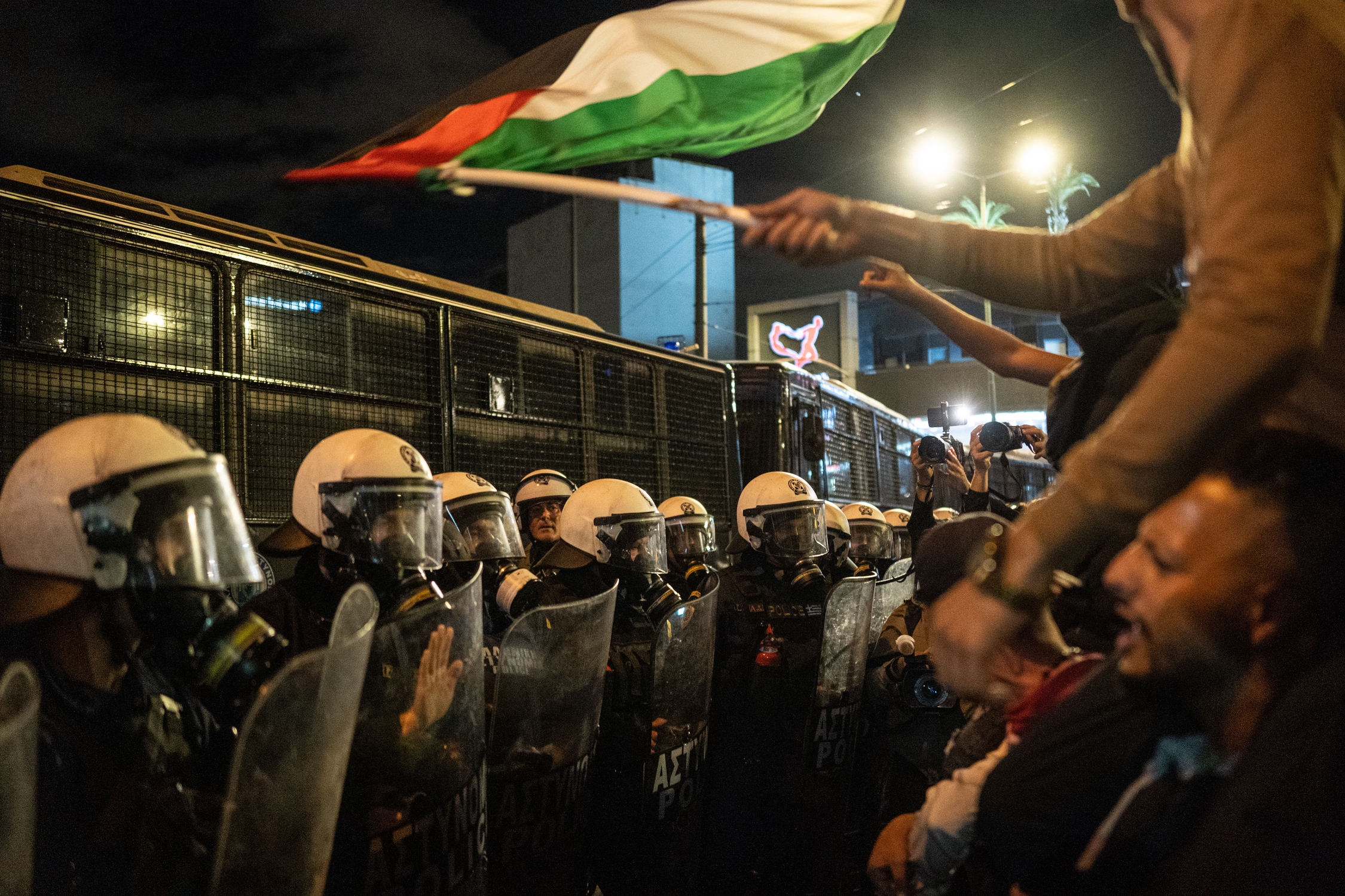 Ακολούθησε πορεία στην πρεσβεία του Ισραήλ στην Αθήνα, όπου την ώρα που έφθαναν από το Σύνταγμα οι πρώτοι διαδηλωτές εκφράζοντας την αλληλεγγύη στον παλαιστινιακό λαό, δέχθηκαν επίθεση με χημικά και χειροβομβίδες κρότου λάμψης από δυνάμεις των ΜΑΤ. Χιλιάδες διαδηλωτές παρέμειναν στην περιοχή φωνάζοντας συνθήματα με κυρίαρχο το «Λευτεριά στην Παλαιστίνη».