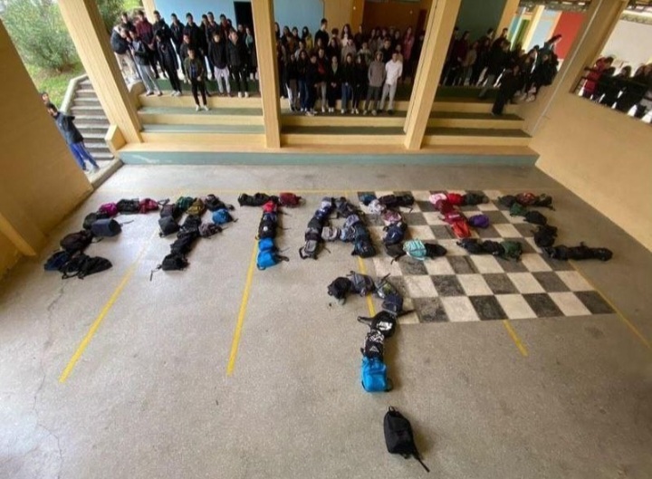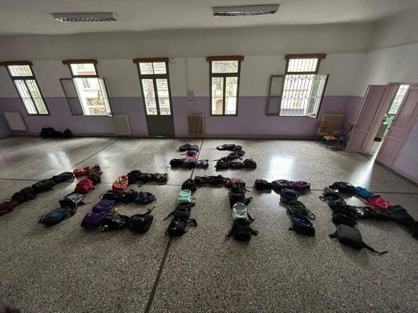 Τέλος, στο 2ο ΓΕΛ Κορδελιού, οι μαθητές σχημάτισαν με τις τσάντες τους τη φράση: «πάρε όταν φτάσεις».