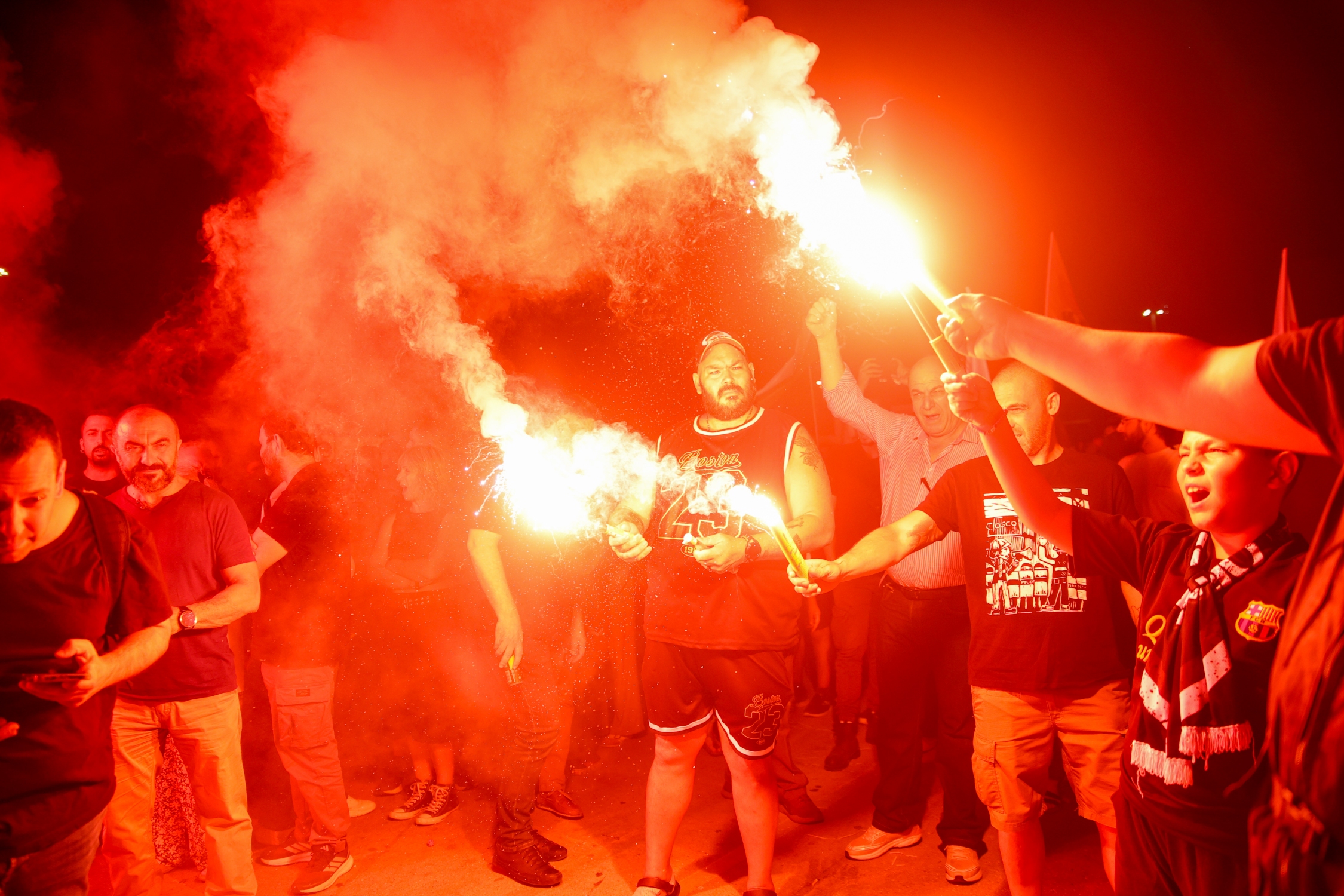 Στην συνέχεια, κόκκινα καπνογόνα φώτισαν τη νύχτα ενώ συνθήματα δόνησαν την ατμόσφαιρα.