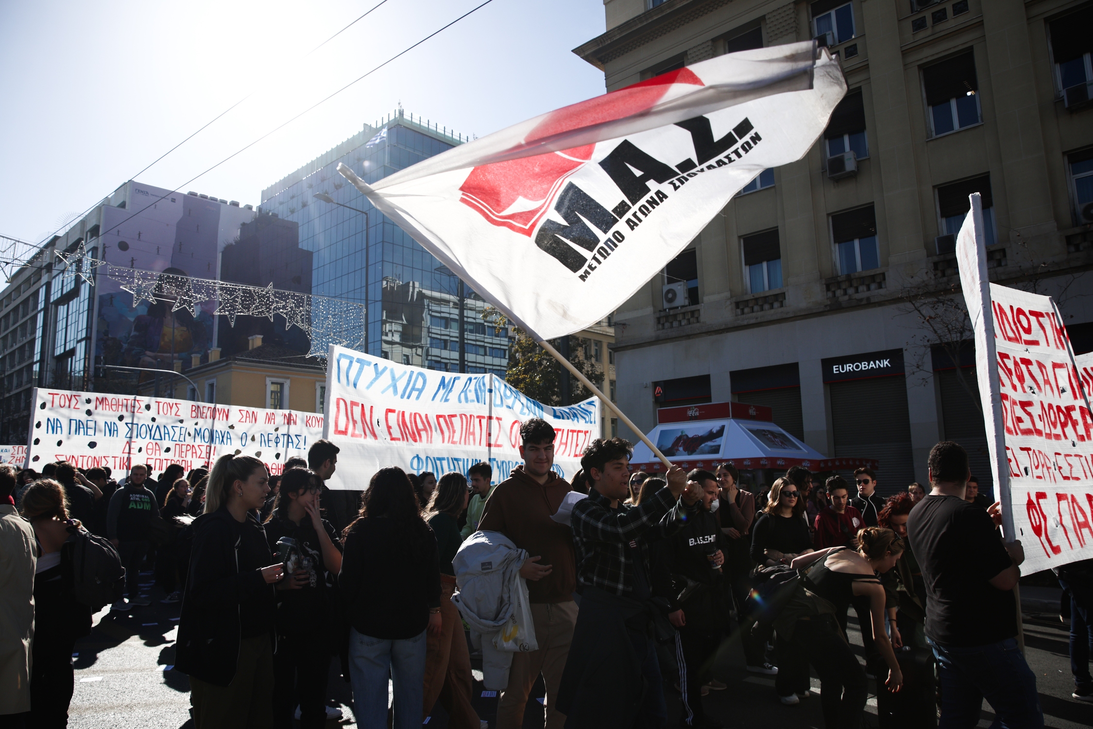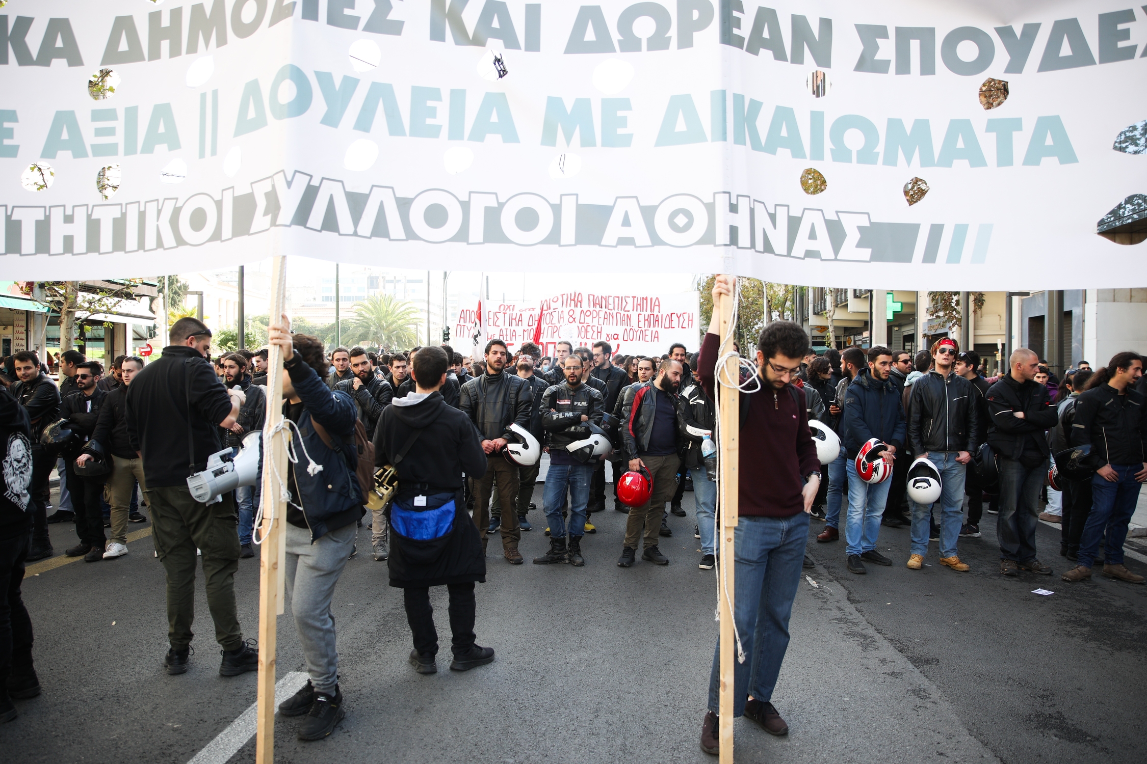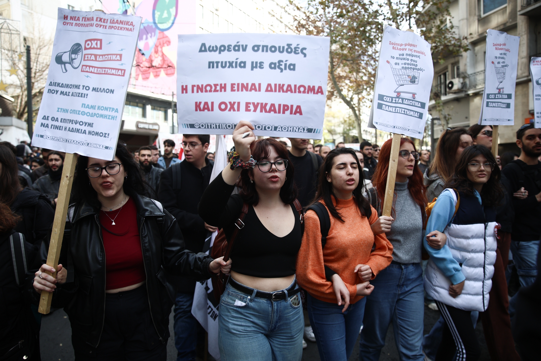 «Όχι στα ιδιωτικά πανεπιστήμια, αποκλειστικά δημόσιες δωρεάν σπουδές, πτυχία με αξία, δουλειά με δικαιώματα» έγραφε το πανό των Φοιτητικών Συλλόγων της Αθήνας που συμμετείχαν μετά τις γενικές συνελεύσεις και καταλήψεις σε όλα τα ιδρύματα της Αθήνας.