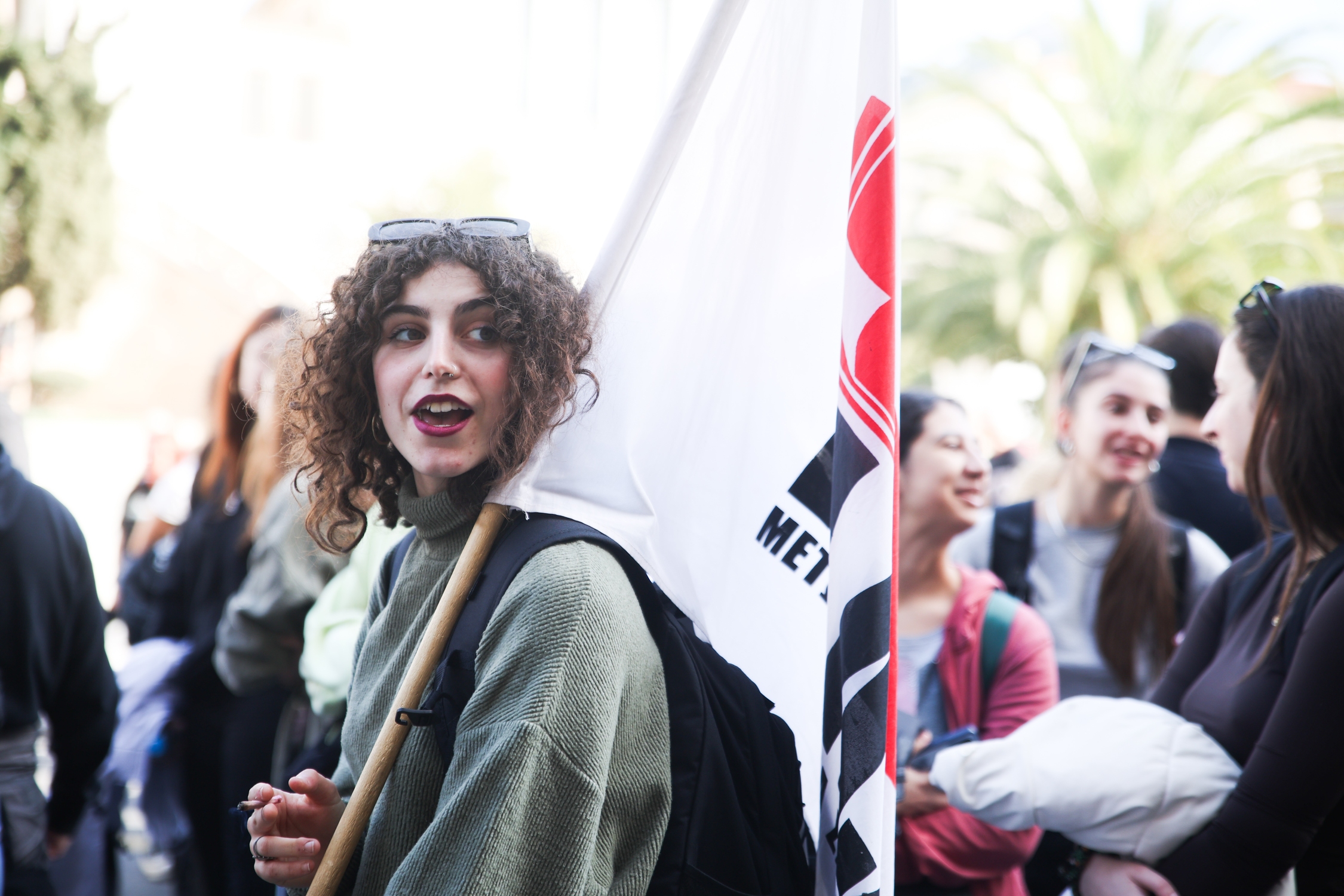 Στο πλευρό τους οι μαθητές, με το πανό της Συντονιστικής τους που γράφει «Τους μαθητές τους βλέπουν σαν να ναι κουμπάράς να πάει να σπουδάσει μονάχα ο λεφτάς. Δεν θα περάσει!».